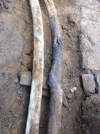 3、用低壓脈沖測試,電纜全長為162米。相間對比在18米左右波形不匹配。用脈沖電流測距,紅相對零線,電壓5KV擊穿,波形顯示故障在距測試端18.7米左右,在配電室南面的綠化帶定位,聽到放電聲。